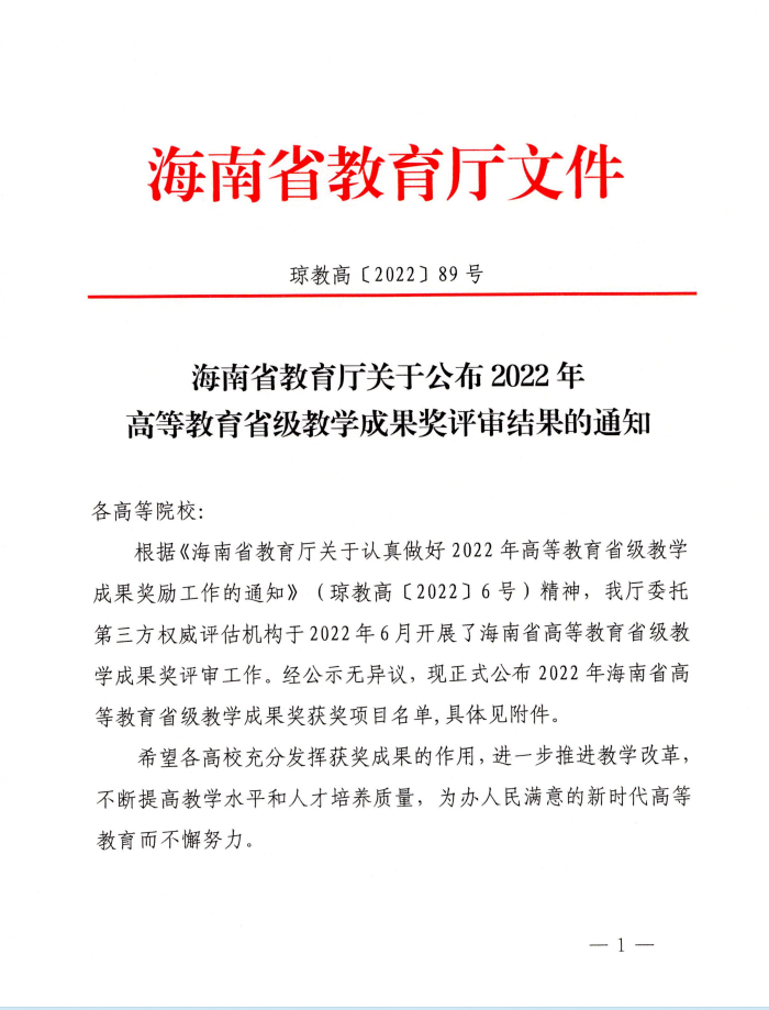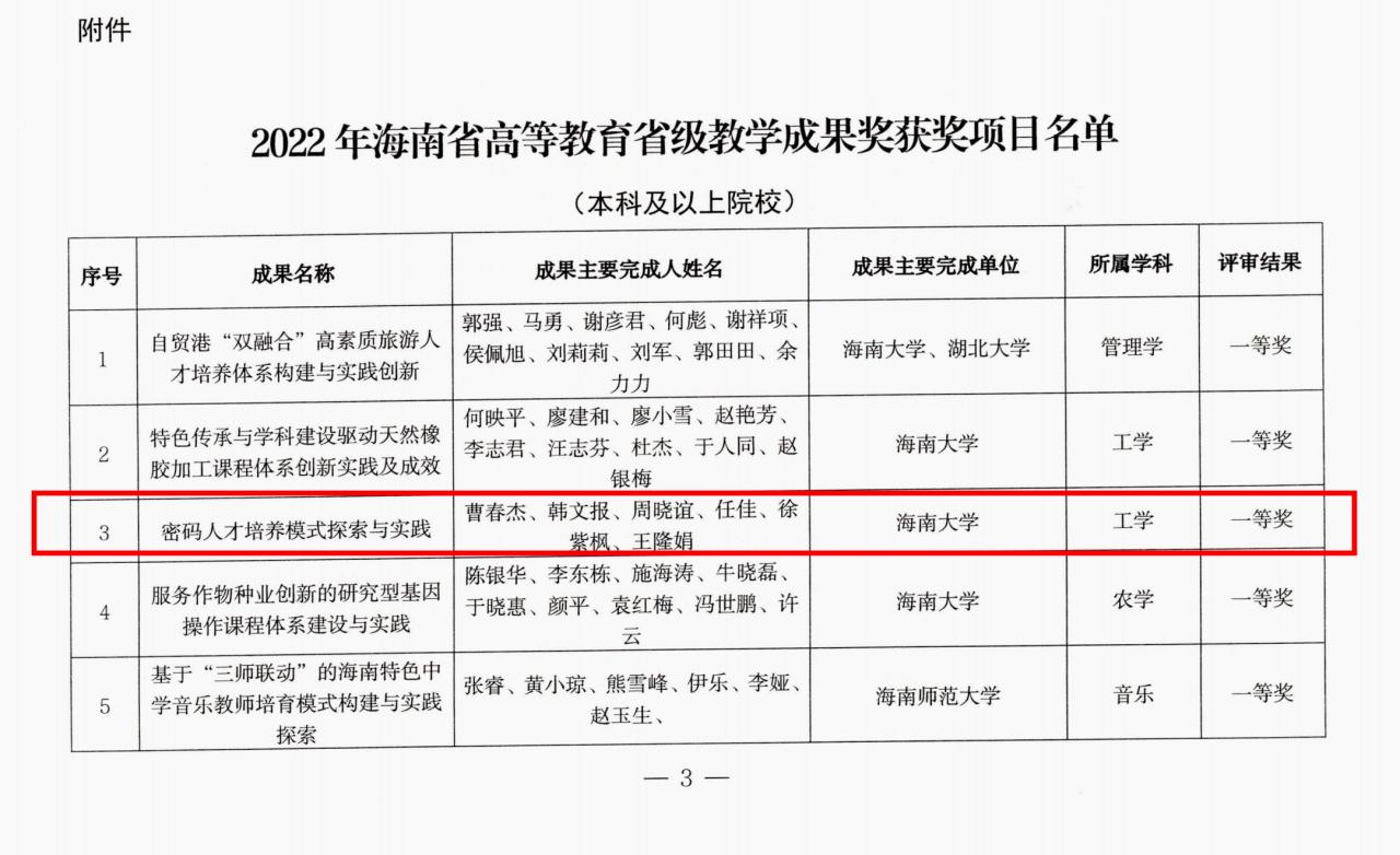 近日,海南省教育厅公布了2022年高等教育省级教学成果奖评审结果,我院《密码人才培养模式探索与实践》项目荣获省级教学成果奖(本科及以上院校组)一等奖,完成人:曹春杰、韩文报、周晓谊、任佳、徐紫枫、王隆娟等。