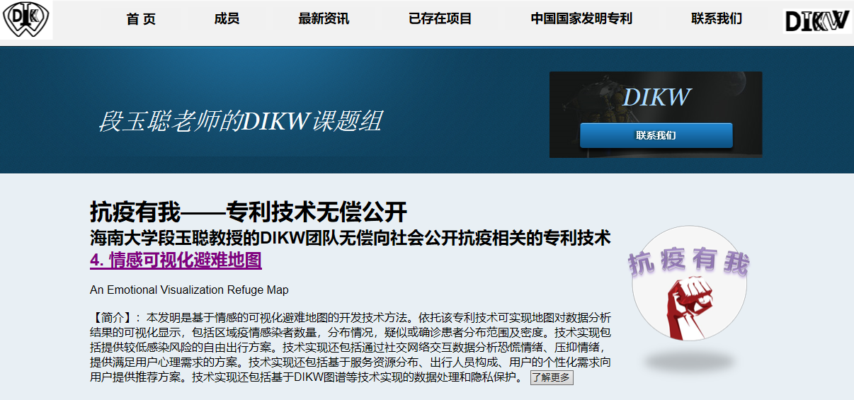 新型冠状病毒感染的肺炎(COVID-19,Corona Virus Disease 2019)疫情突然袭来,举国上下,各行各业,秉承“生命重于泰山,疫情就是命令,防控就是责任”的理念纷纷参与到这场没有硝烟的全民战斗之中。WilliamHill体育的广大师生也纷纷响应号召,或成为 “科技抗疫逆行者”中的一员挺身而出,或坚守岗位积极服务于抗疫工作。 为进一步服务提升海南省旅游系统对疫情及防控数据的获取和分析能力,WilliamHill体育计算机与网络空间安全学院段玉聪教授带领曹凯博士等DIKW团队成员,经过有针对性地筛选和讨论研究,将根据抗疫管理单位或者生产企业抗疫需求,以及面向旅游、景区等受疫情冲击的中小企业的发展需求,优先从已申请的124项国家发明专利技术(包含24项已授权的国家发明专利)中选取相关“情感可视化避难地图”、“基于偏差器官形态行为可视化的口语学习矫正方法”、“面向类型化资源的自动安全态势感知、分析与报警系统”等专利技术进行无偿技术支援与免费技术服务咨询支持。“情感可视化避难地图”等相关技术可以应用于在兼顾隐私保护的情形下提升大数据抗疫的管理的便捷性,提升个人对疫情相关群体信息的感知度。“基于偏差器官形态行为可视化的口语学习矫正方法”等授权技术可以弥补疫情条件下外语学习发音个性化矫正的信息技术需求。“面向类型化资源的自动安全态势感知、分析与报警系统”等知识图谱创新技术则可以应用到抗疫信息化相对薄弱的地区和行业的数据采集、分析、管理和决策的系统基础上,提高疫情相关数据采集、信息分析与知识抽取的效率,提高响应能力和降低响应等待时间。