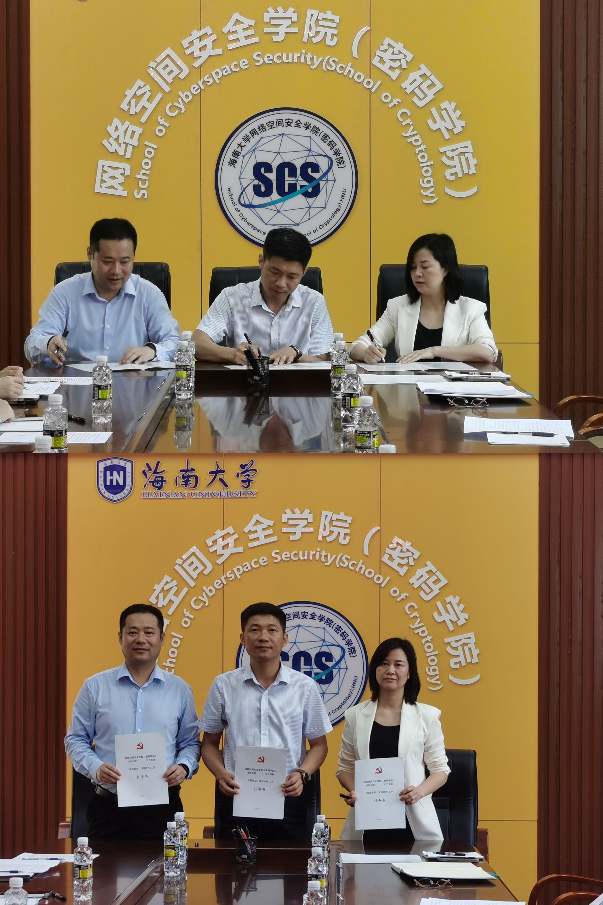 天工书院党委书记易振(左)、网络空间安全学院(密码学院)党总支书记陈广锐(中)、淳明书院党委书记周郭军(右)签订任务书